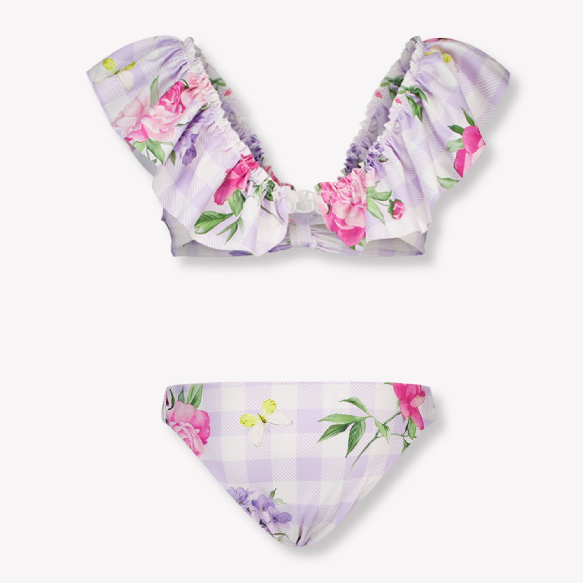 Laat haar stralen aan het zwembad of op het strand met deze betoverende MonnaLisa bikini in lila. De zachte pastelruitjes worden verfijnd gecombineerd met een romantische bloemenprint en elegante ruches aan het topje. Een charmante keuze voor zomerse dagen vol plezier, met een pasvorm die zowel speels als comfortabel is. Perfect voor stijlvolle meisjes die houden van kleur, vrolijkheid én luxe flair 🌸☀️