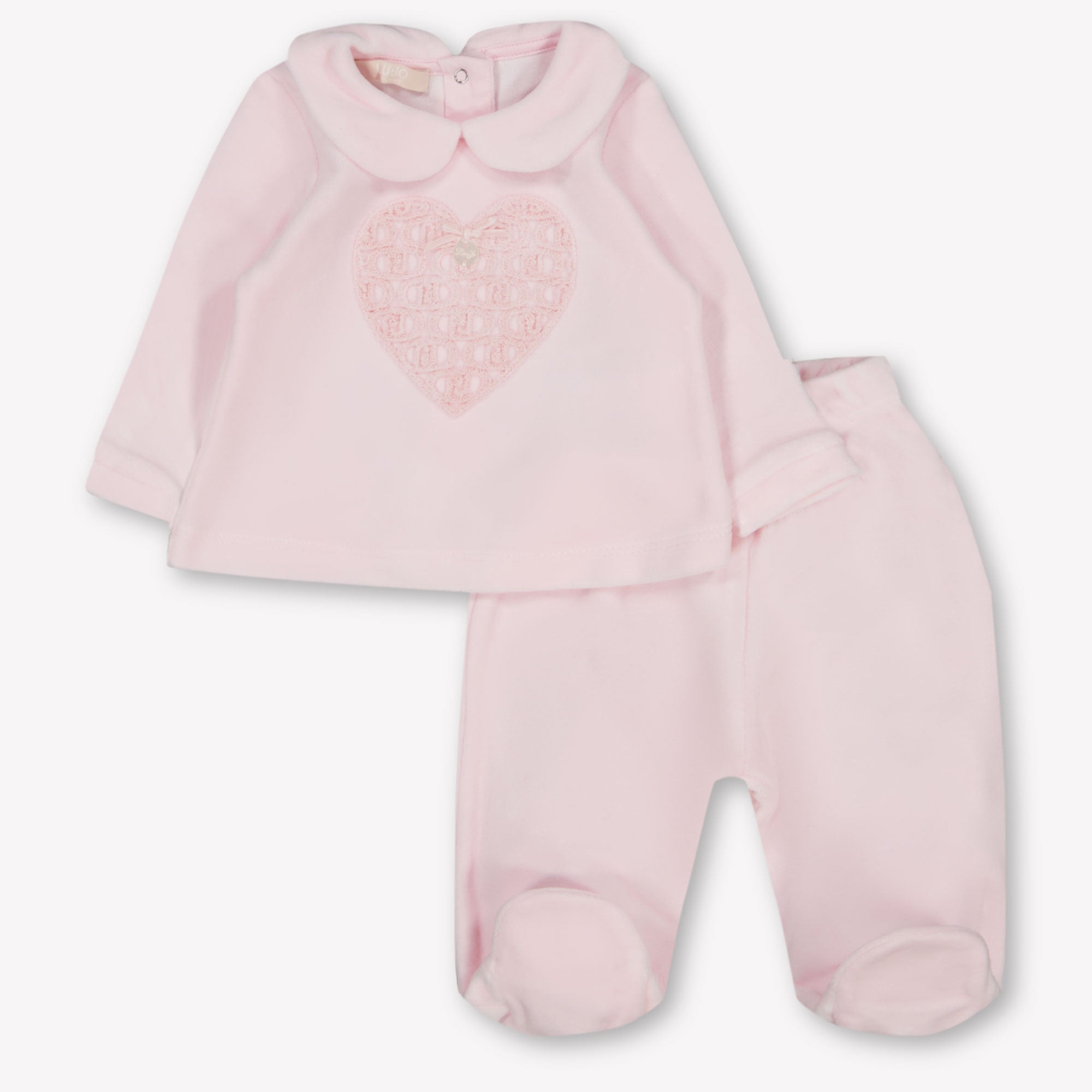 Discover the magic of soft comfort with it Liu Jo Baby girls Playsuit in Light Pink. This sophisticated ensemble, with its delicate collar and subtle heart motif, envelops your little one in luxury.